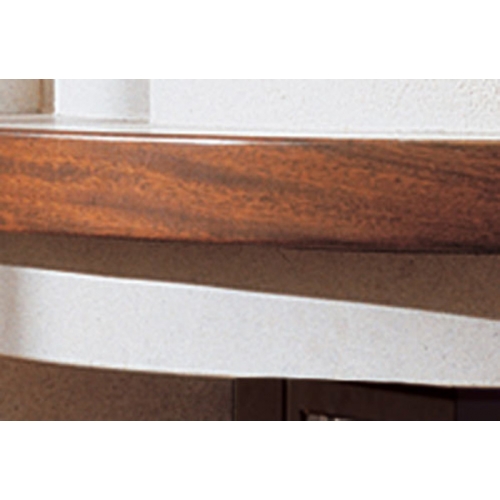 Угловая облицовка отличается закругленностью линий, цокольная и боковые части - из колотого желтого мрамора реале. Плита и топочное обрамление из полуполированного золотистого мрамора, деревянная балка. Металлический дровник черного цвета.