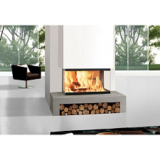 Каминная топка для открытой или закрытой системы. Корпус из утолщенной стали, чугунный очаг, витрокерамическое стекло, резистентное к терпературе до 800°, бак для воды на 60 литров.